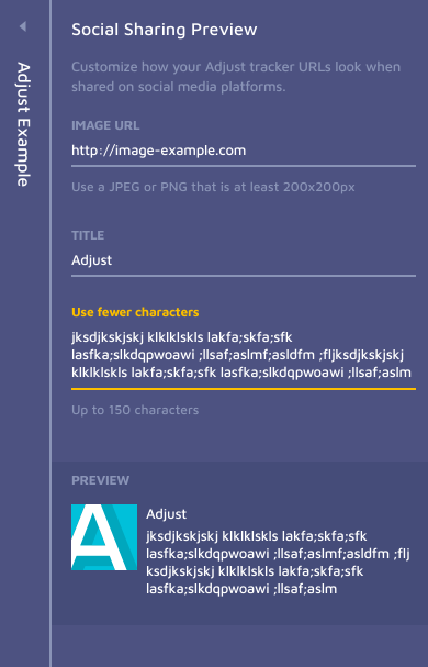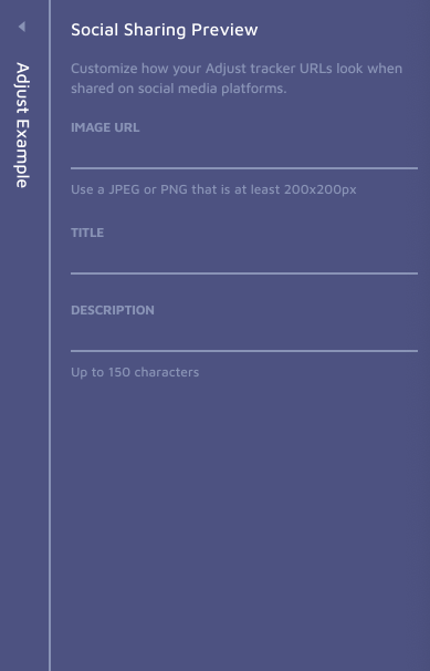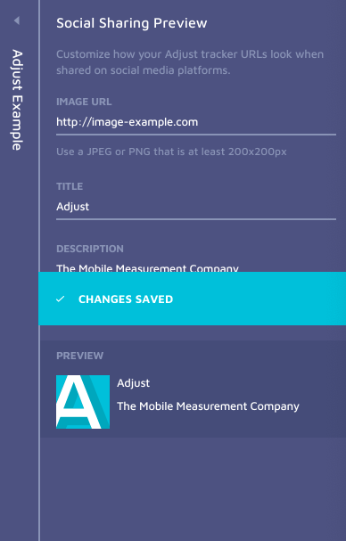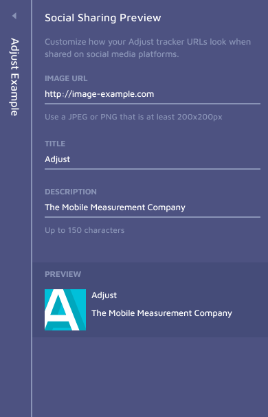 In Adjust, users create tracker URLs that can be shared on social media. The “Social Sharing Preview” feature lets users customize the preview image and text that appear when their Adjust Tracker URL is shared via WhatsApp, Facebook, WeChat, and more.