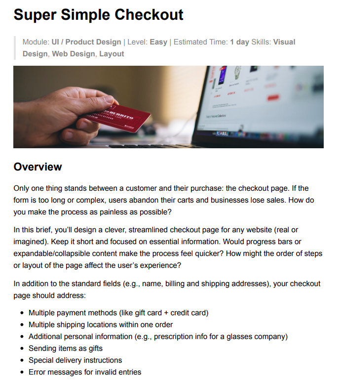The Product Design curriculum included four modules: Visual Design Basics, UX / Interaction Design, UI / Product Design, and Career Development. Each module contained increasingly challenging projects that culminated in a capstone incorporating all previous skills. See the full curriculum I wrote.