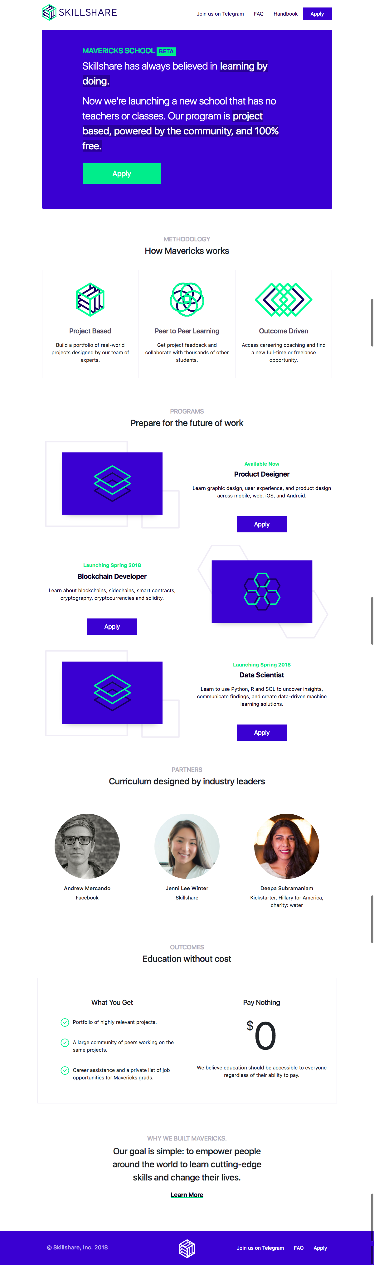 When I joined this project as a freelancer, the founder and CEO of Skillshare knew what he wanted Mavericks to accomplish. The “how” was a little less clear. Along with a handful of advisors, I worked with him to determine the program structure, graduation requirements, and projects themselves.